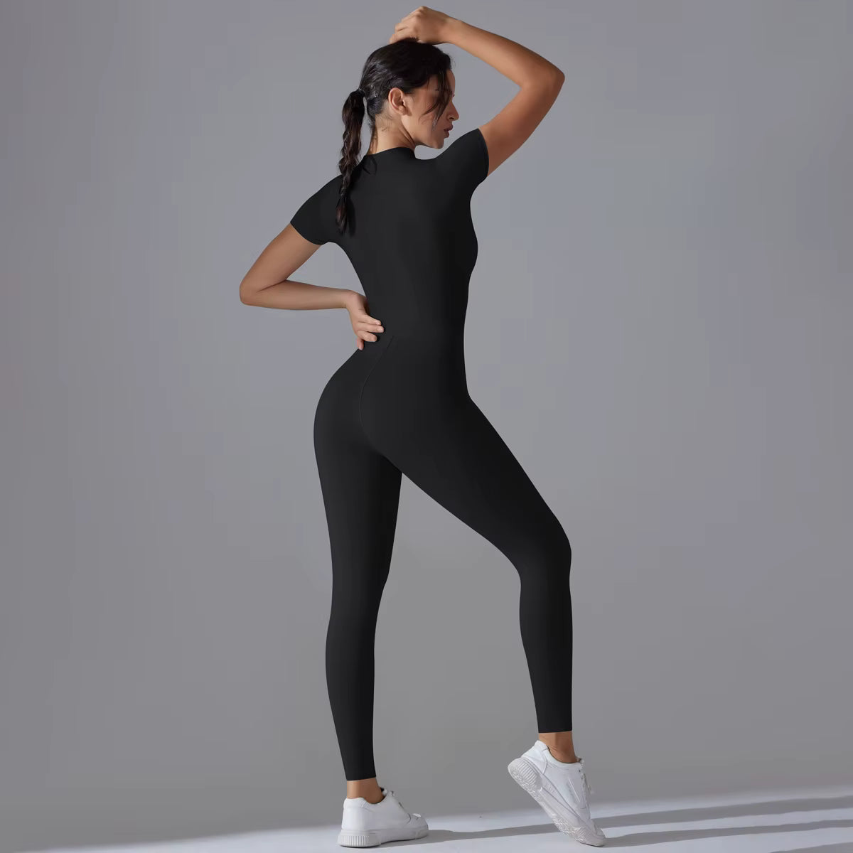 Presenta mangas cortas y una cremallera frontal funcional para una cobertura ajustable, mientras que el diseño de leggings de largo completo alarga la figura con una estética limpia y minimalista.